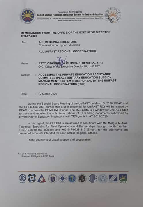 Memo by PEAC to PHEIs on Processing of TES Payments |